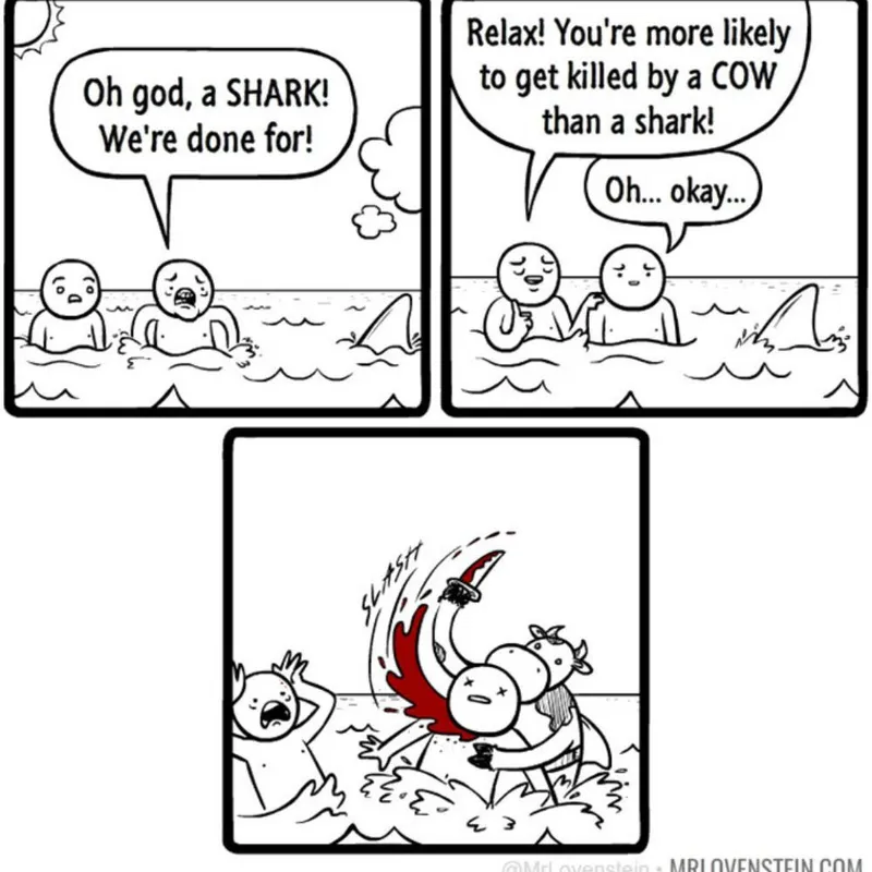 Imagine being taken out by a cow instead of a shark—it sounds ridiculous, but it’s not impossible. The humor lies in the exaggerated paranoia we have about wild, cinematic dangers while completely overlooking mundane threats. It’s a funny and thought-provoking reminder that reality often bites harder than fiction—especially when it moos.