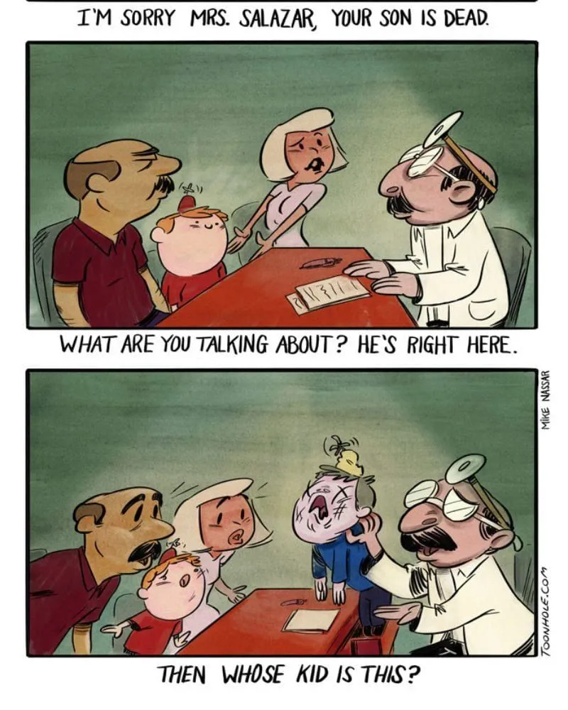 But the punchline flips the tension completely. Instead of a medical emergency, the “bad news” is… surprisingly bizarre. It seems the child isn’t in the hospital bed, but in the desk drawer. While it’s totally unrealistic, it’s also hilariously absurd. It pokes fun at the nerves that come with receiving serious news and reminds us that sometimes, the unexpected is better than feared.