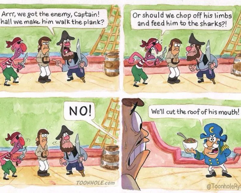 Instead of sharks or swords, this pirate opts for a far more cereal form of punishment—feeding enemies Cap’n Crunch until their mouth bleeds. It’s a silly exaggeration, but anyone who’s crunched through a dry bowl knows the pain. It’s a perfect blend of cartoonish violence and everyday truth. Who knew breakfast could be so brutal?
