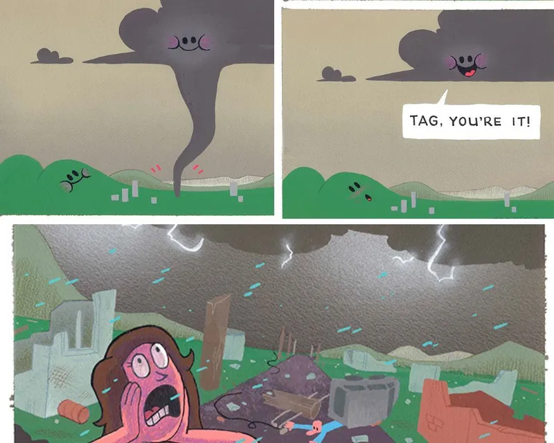 The comic starts out innocent enough: two twisters just having fun. Until you realize… wait, their idea of tag involves hurling cows and flipping houses. For the towns below, this is less a game and more a disaster movie. It’s a fun, exaggerated reminder that even innocent games can have major consequences.