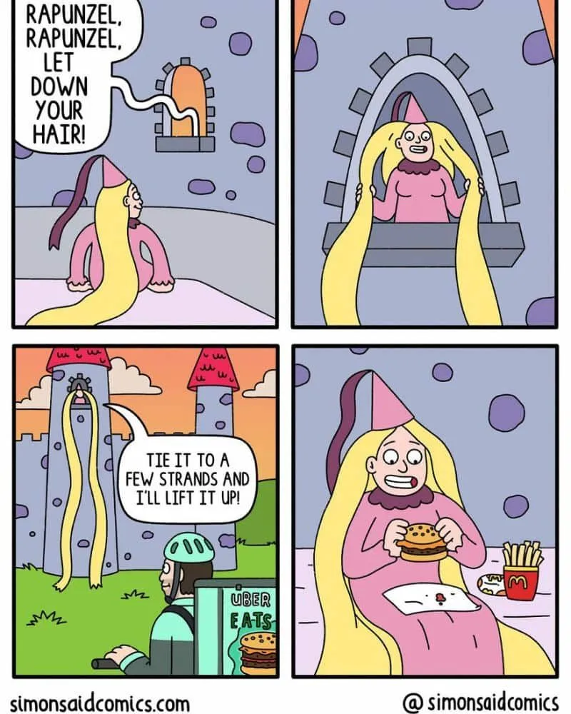 In this comic, Rapunzel flips the script. Instead of waiting, she’s using that hair for what really matters: getting takeout delivered. Why suffer in solitude when you can get fries with that freedom? It’s a clever and funny update that shows how even princesses can adapt to modern life—with a little creativity and a lot of hair strength.