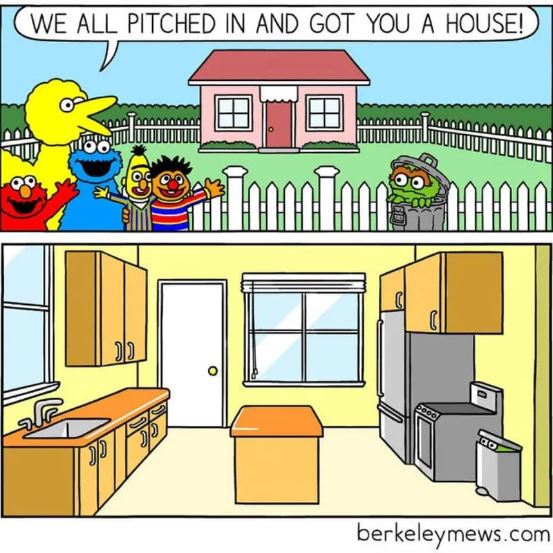 This comic imagines that scenario, and the result is both hilarious and relatable. Even with a cozy new house, Oscar can’t help but miss his old setup. Comfort zones are strange like that—sometimes it’s not about where you should be, but what you’re used to. It’s a playful look at how we cling to the familiar, even when it smells like trash.
