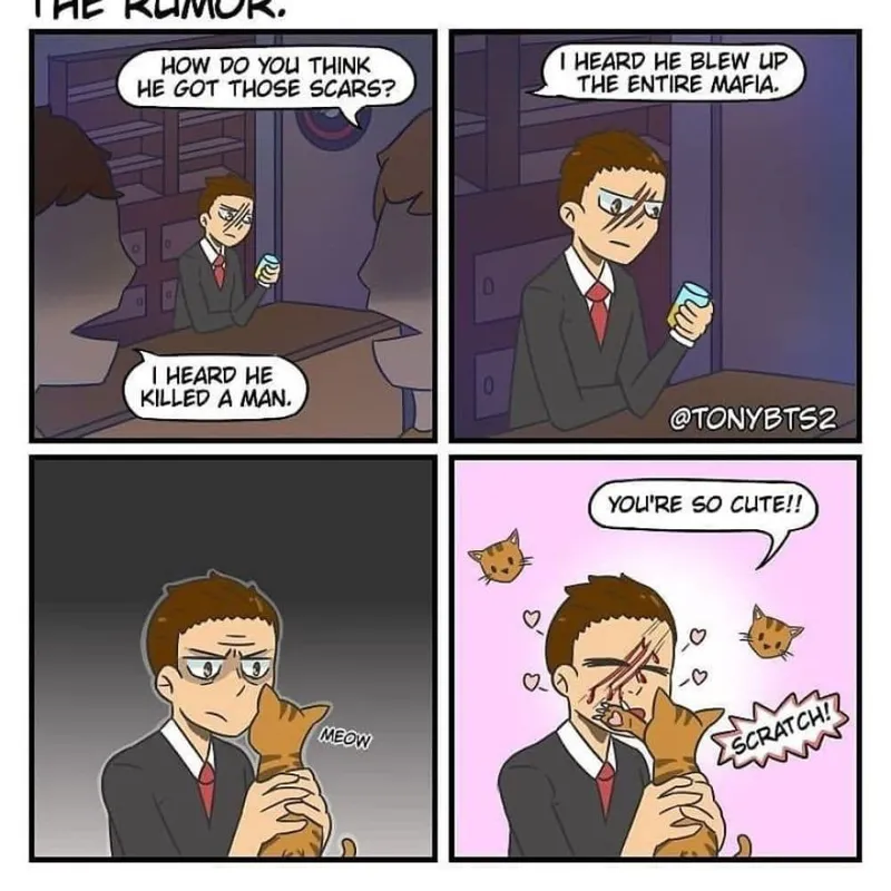 Sometimes, people (or cats, in this case) get a bad rep. You assume they’re dangerous or unapproachable until you get too close—scratch! Suddenly, you realize they might not be the villain you made them out to be… or maybe they are. Still, this comic captures the absurdity of assumptions with a perfectly timed feline twist. You never really know someone until they leave their mark—sometimes literally.