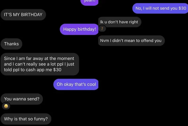The best part is the message where they call this “friend” poor and then say they didn’t mean to offend them. People aren’t poor just because they don’t want to send you money.