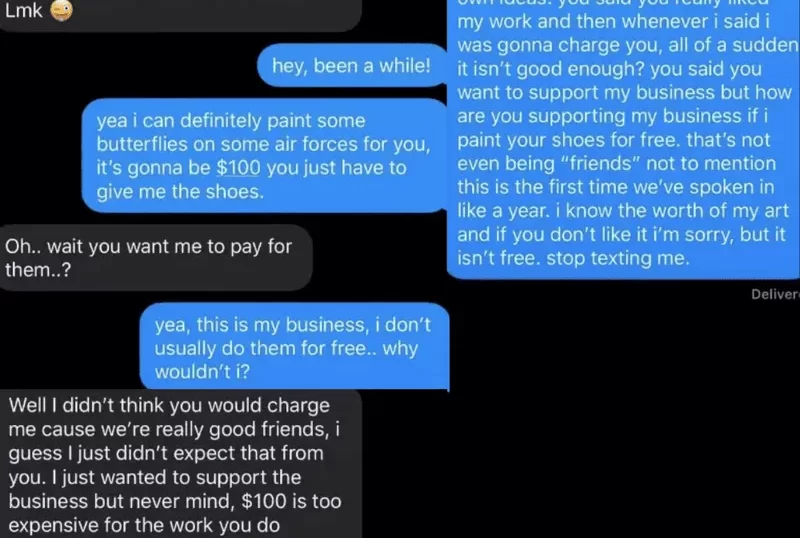 That was absolutely the case here, when this girl thought it was totally fine to ask for expensive shoe art for free and then belittle her friend when she said no. It takes a lot of guts to be this shameless.