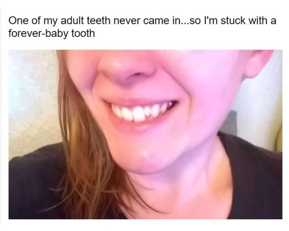 This unique dental situation can result in an unusual smile characterized by the absence of certain adult teeth. Interestingly, this distinct feature is not immediately evident, and most people would likely not notice it unless it’s pointed out. However, the person in question takes pride in this dental peculiarity, proudly displaying it as a part of their individuality.