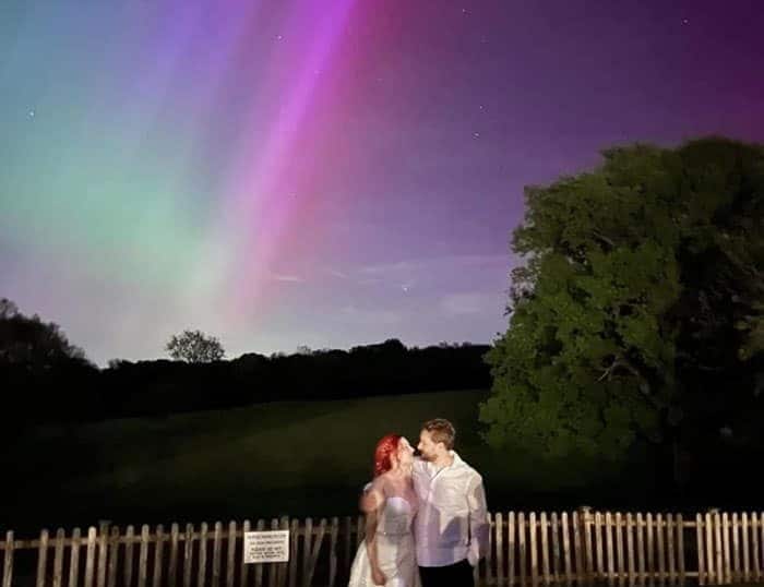 This couple already had a memorable wedding planned, but fate decided to add something spectacular. On the evening of their ceremony in England, the Northern Lights shimmered across the sky. The vibrant greens and purples created a breathtaking backdrop for wedding photos.