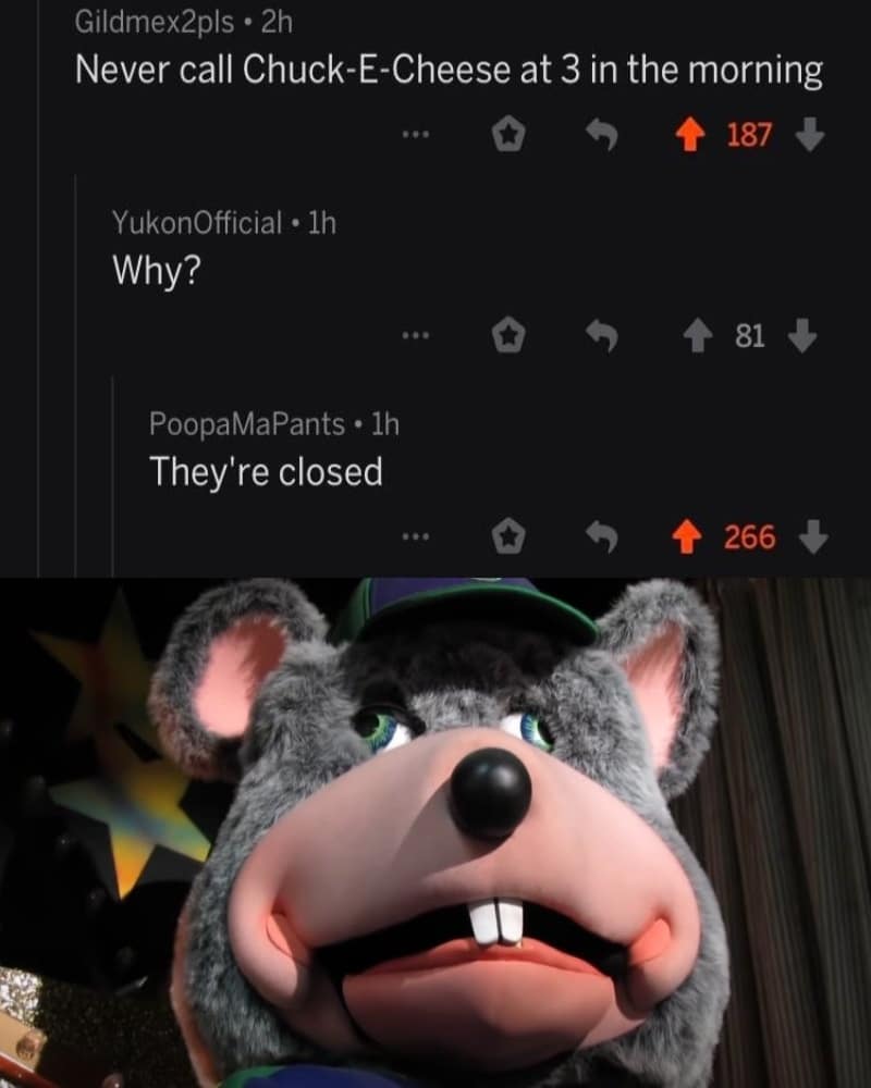 Recently, a post appeared online that seemed to promise yet another eerie experience: “never call Chuck-E-Cheese at 3 in the morning.” Naturally, the mind immediately conjures up all manner of terrifying scenarios. What could possibly happen when you make such a call in the dead of night? However, the truth is far less dramatic – as the OP points out, you shouldn’t call Chuck-E-Cheese at that hour because they are closed! It’s an anticlimactic conclusion to what could have been a terrifying tale, but it serves as a reminder that sometimes the scariest stories are the ones we create in our own minds.
