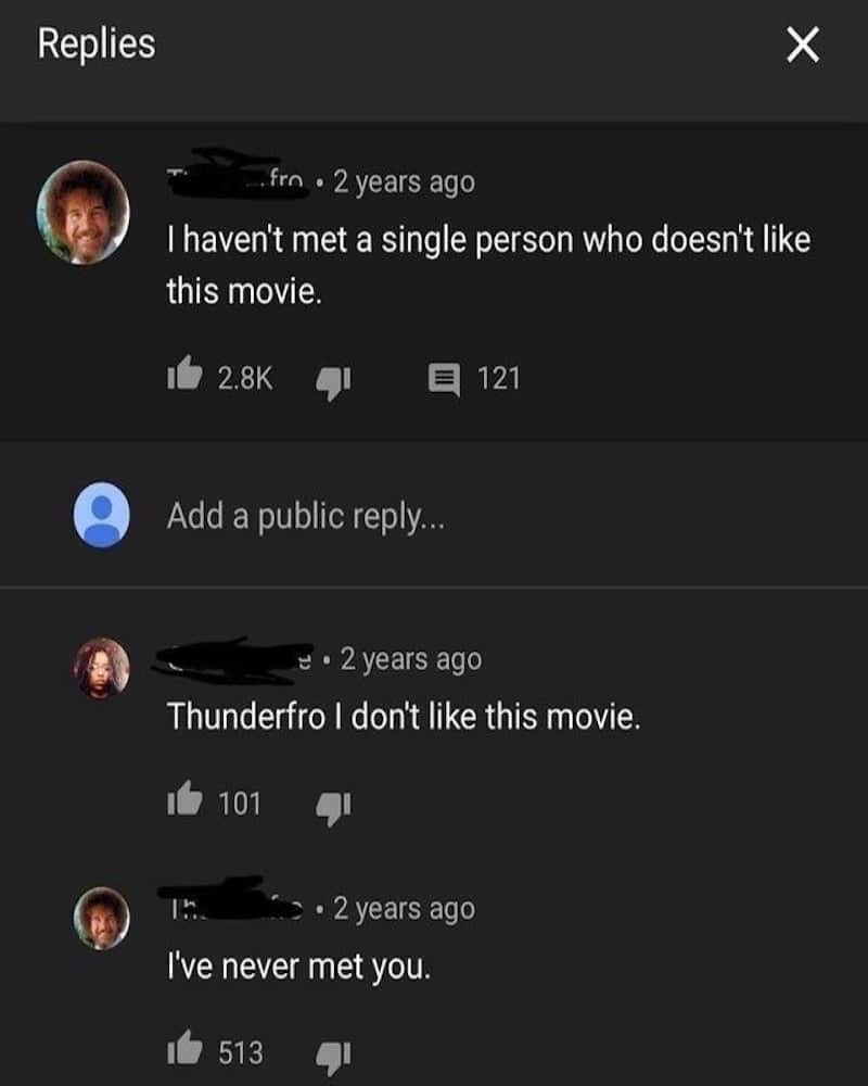 If you are a die-hard fan of a book, artist, or movie, it is likely that you can’t resist talking about how amazing it is and recommending it to everyone you know. However, when you love something so much, it can be challenging to accept criticisms from those who do not share the same passion as you. This is exemplified in an online conversation where a person made a confident statement, claiming to have never met anyone who disliked a particular movie. Unfortunately, as expected, someone commented, expressing their negative opinion about the movie. Rather than accepting the criticism, the original poster cleverly stuck to the technicality of the statement and retorted, “I’ve never met you.” The response was witty and amusing, demonstrating how people can sometimes take their love for something to the extreme.