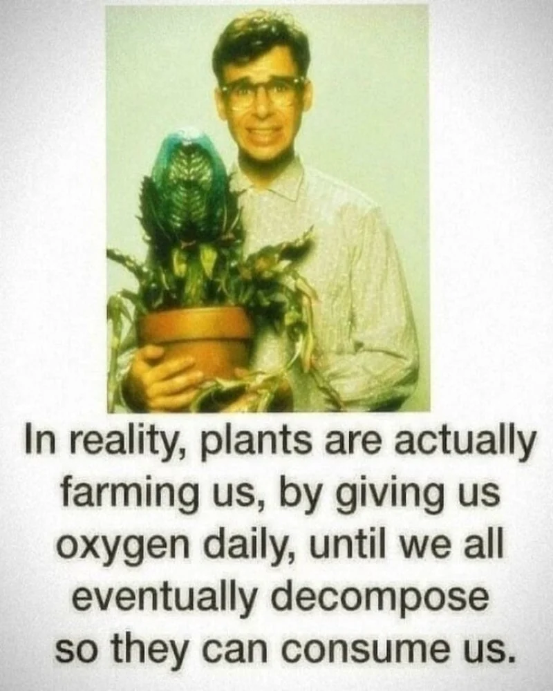 However, when we eventually pass away and decompose, those same plants will consume our remains, completing the circle of life in a somewhat grim and unsettling way. While this realization may seem bleak, it highlights the intricate and interconnected nature of life on our planet, reminding us of the importance of caring for and respecting all living things. The playful wordplay at the end of the post also demonstrates the power of humor to address serious topics in a lighthearted and relatable way, allowing us to process difficult realities with a touch of levity.